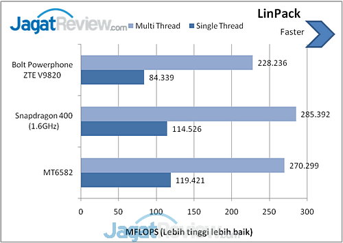 LinPack merupakan benchmark untuk CPU yang digunakan untuk mengukur seberapa cepat perangkat Android Anda. Hasilnya dalam bentuk MFLOPS(Million Floating Point Per Second). Semakin tinggi nilainya, semakin bagus.