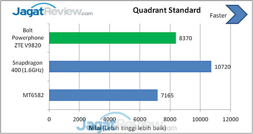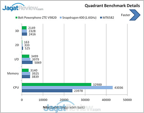 Quadrant adalah benchmark untuk CPU, I/O, dan grafis 3D. Versi yang kami gunakan adalah Standard Edition yang bisa diunduh secara gratis. Semakin tinggi nilai yang dihasilkan benchmark ini, semakin baik.