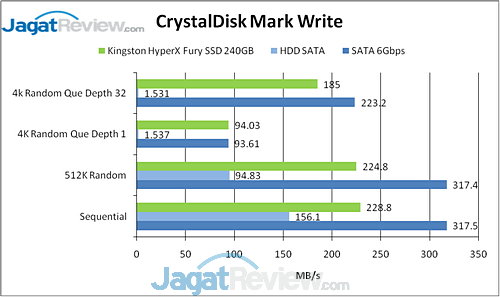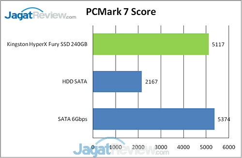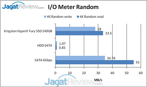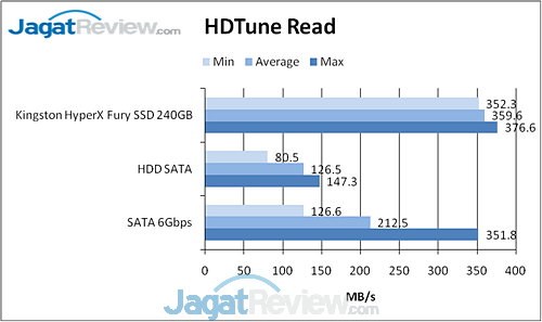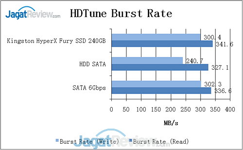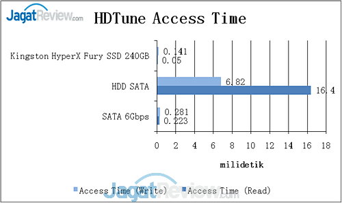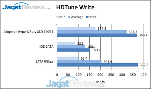 Dengan HDTune, terlihat Kingston HyperX Fury 240GB mampu unggul jauh dari HDD SATA. Selain itu, performanya pun lebih baik dan stabil jika dibandingkan dengan SSD SATA 6Gbps lainnya.