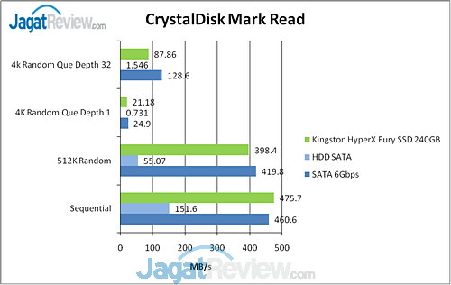 Pengujian Kingston HyperX Fury 240GB menggunakan CrystalDisk Mark mampu mengeluarkan potensi yang sesungguhnya dari SSD ini. Kencang terutama untuk Read.