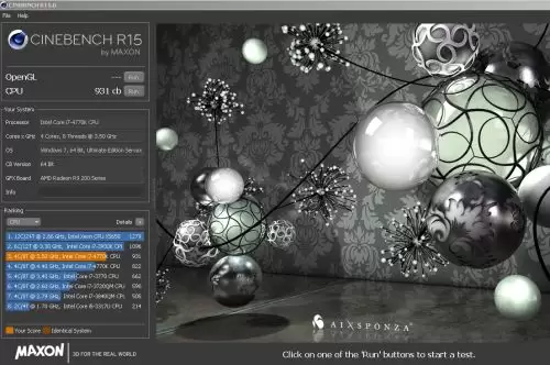 Cinebench R15 merupakan aplikasi pengujian untuk mengukur kinerja prosesor dalam me-render sebuah scene 3D. Hasil pengujian disajikan dalam bentuk points, semakin tinggi points yang dihasilkan, semakin baik.