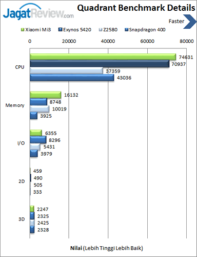 Aplikasi gratis yang satu ini menghitung nilai dari CPU, I/O, dan GPU dengan menggunakan engine software tersendiri. Semakin tinggi nilainya, semakin baik. Di versi standar yang dapat dipakai oleh semua orang ini, perolehan yang didapat hanyalah nilai totalnya. Versi yang digunakan pada artikel kali ini adalah Quadrant Standard versi 2.0 yang memiliki hasil berbeda dengan versi sebelumnya, akan tetapi menampilkan hasil lengkap tanpa harus membeli versi berbayarnya.