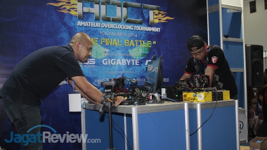 Pertandingan pertama di hari Minggu ini mempertemukan dua overclocker yang namanya cukup menonjol di kalangan alumni Amateur Overclocking Tournament. Rhodie adalah salah satu dari 3 besar AOCT 2013 DIY & Jawa Tengah yang telah menjalani debut Internasional di MSI MOA 2014. Sementara Ali Mukhtar adalah jawara AOCT 2013 Jawa Timur. Keduanya akan beradu kemampuan dalam benchmark AIDA 64 Memory Read Bandwidth.