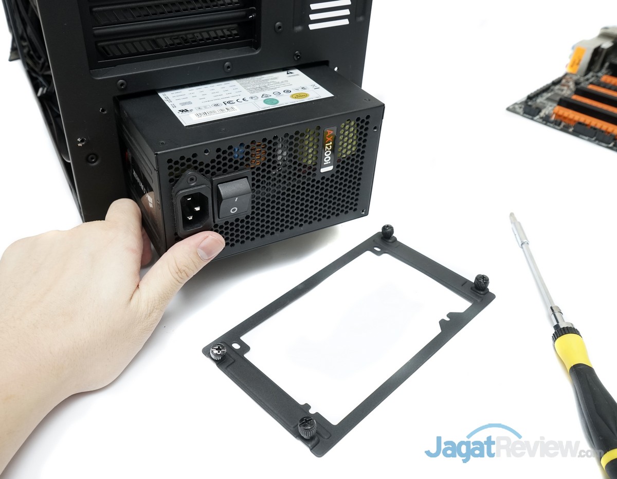 Untuk pengujian pada casing ini, kami menggunakan PSU Corsair AX1200 Watt yang cukup panjang. Untuk memasang PSU ke dalam casing, Anda harus membuka penutup ruang PSU, kemudiam mendorong PSU ke dalam tempatnya, dan terakhir menguncinya dengan menggunakan penutup yang dilepas sebelumnya. Anda harus membaut PSU ke penutup, lalu membaut penutup ke casing.
