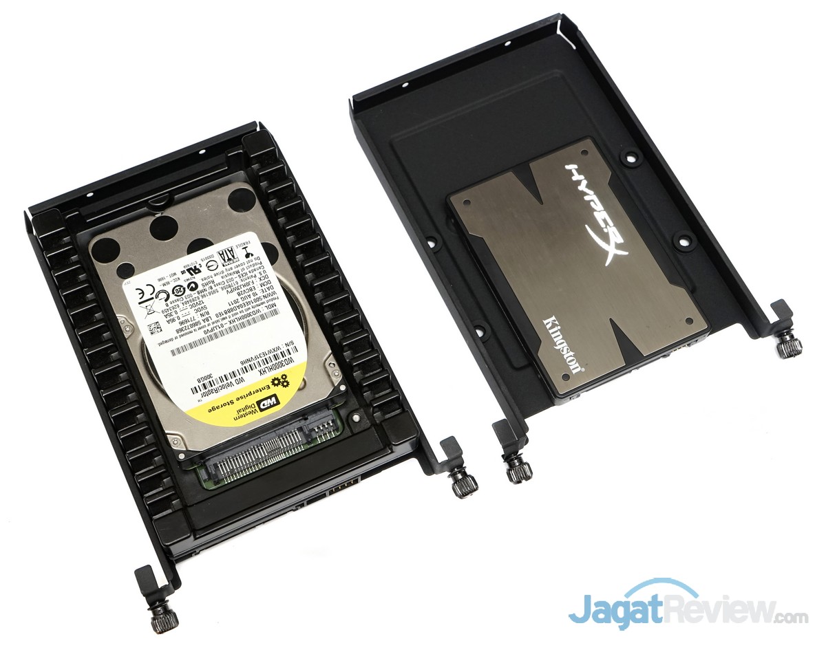 Pada pemasangan harddisk dan SSD, kami dapat dengan mudah memasang harddisk dan SSD pada bracket storage milik casing NZXT H440 Razer Edition ini. Hanya saja, cukup disayangkan mekanisme pengunci storage yang ada pada casing ini tidak dilengkapi dengan sistem screwless.