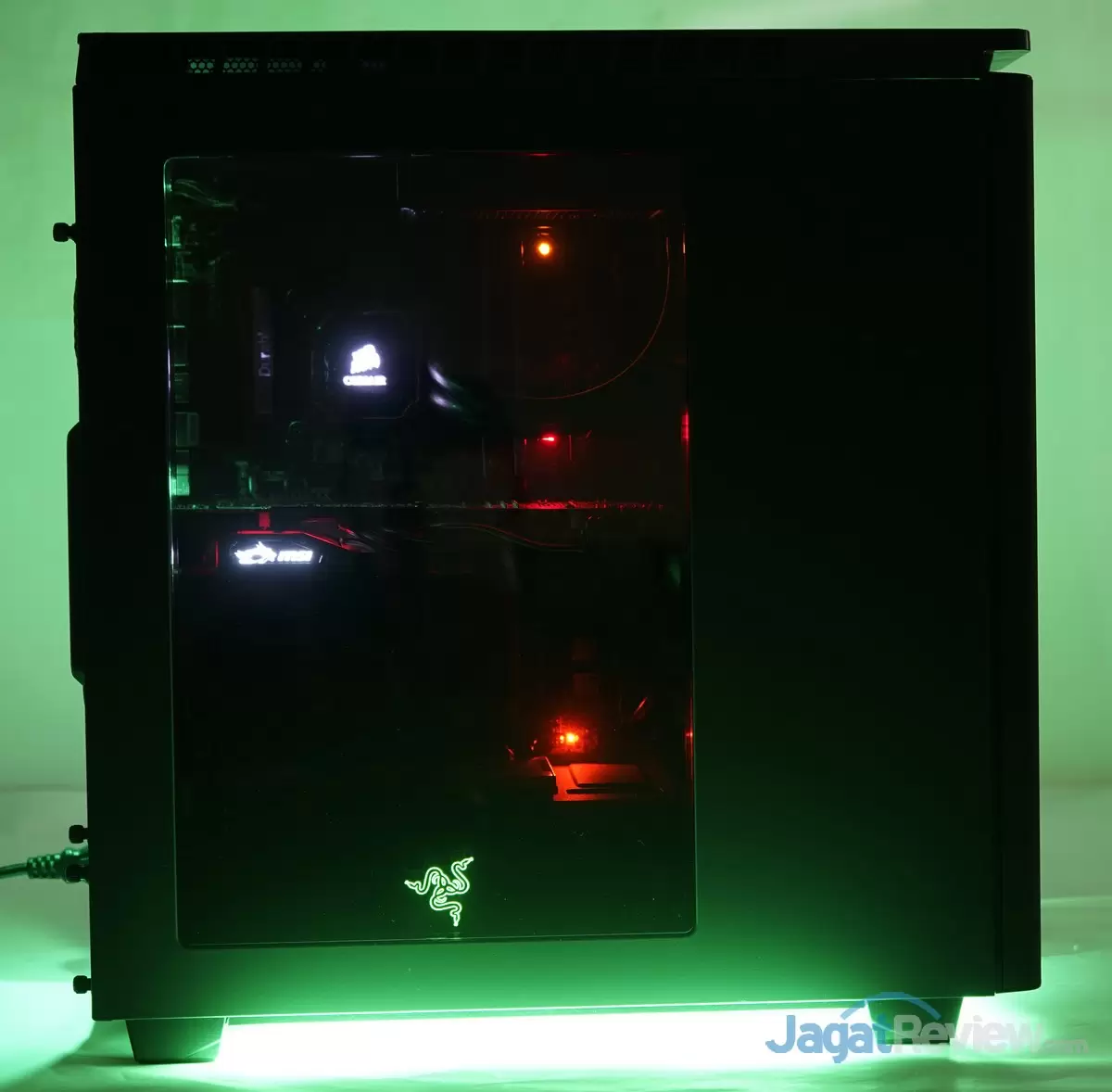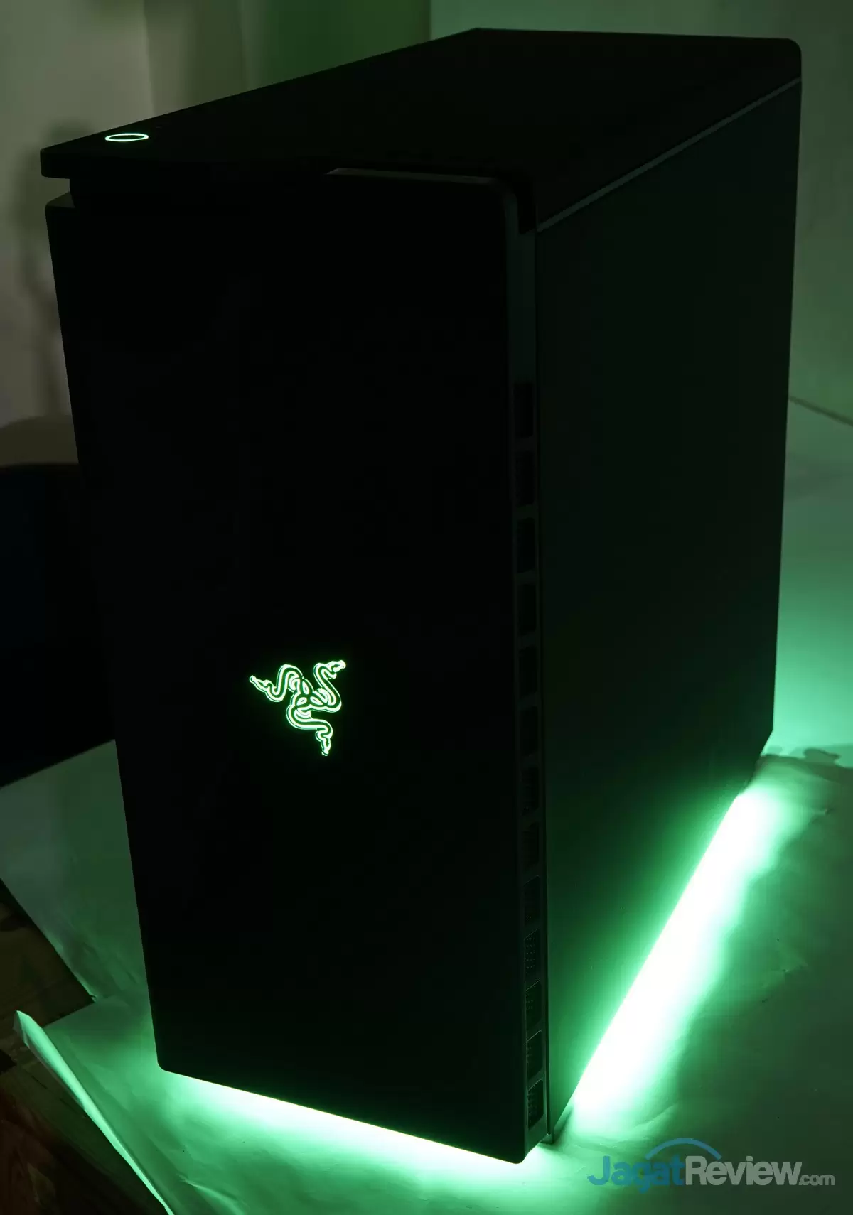Logo Razer pada penutup ruang power-supply juga dilengkapi dengan lampu LED berwarna hijau yang akan menyala ketika sistem dianyalakan.