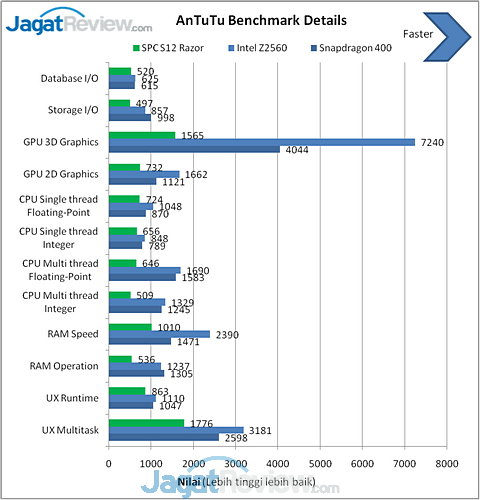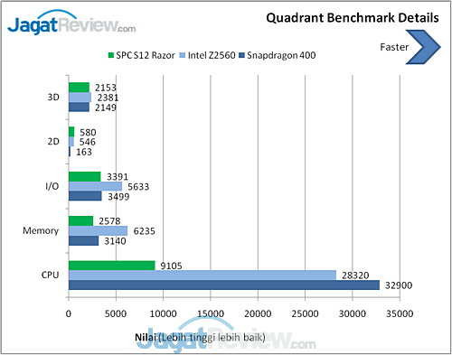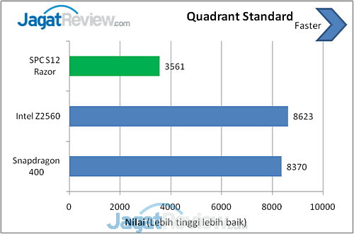 Quadrant adalah benchmark untuk CPU, I/O, dan grafis 3D. Versi yang kami gunakan adalah Standard Edition yang bisa diunduh secara gratis. Semakin tinggi nilai yang dihasilkan benchmark ini, semakin baik.