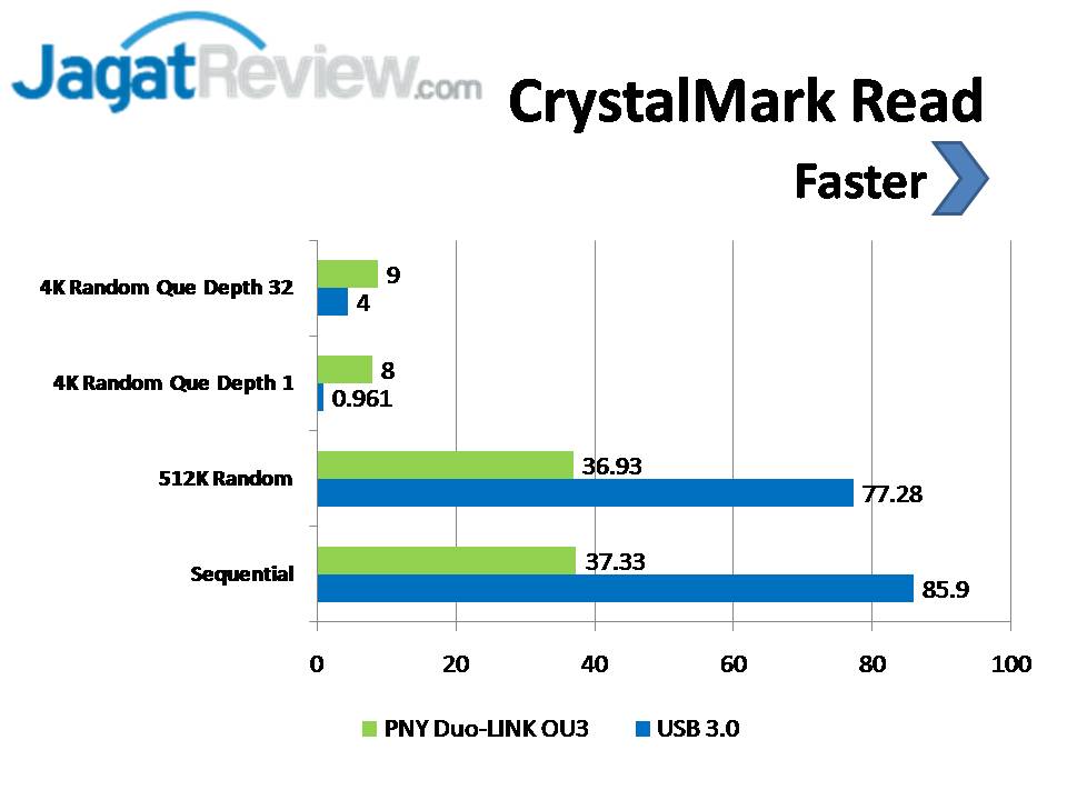 Berdasarkan hasil pengujian yang dilakukan dengan CrystalDisk Mark, terlihat bahwa USB PNY Duo-LINK OU3 tidak memiliki performa yang sama atau lebih baik dari USB 3.0 sejenis, baik untuk kemampuan Baca (Read) maupun kemampuan Tulis (Write).