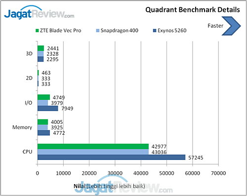 Quadrant adalah benchmark untuk CPU, I/O, dan grafis 3D. Versi yang kami gunakan adalah Standard Edition yang bisa diunduh secara gratis. Semakin tinggi nilai yang dihasilkan benchmark ini, semakin baik.
