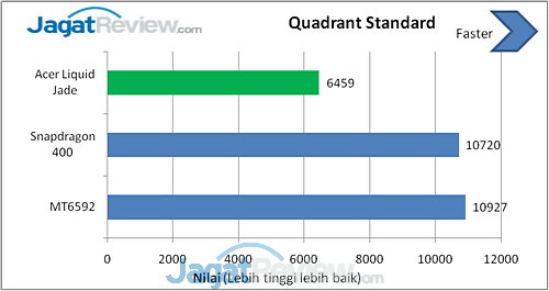 Quadrant adalah benchmark untuk CPU, I/O, dan grafis 3D. Versi yang kami gunakan adalah Standard Edition yang bisa diunduh secara gratis. Semakin tinggi nilai yang dihasilkan benchmark ini, semakin baik.