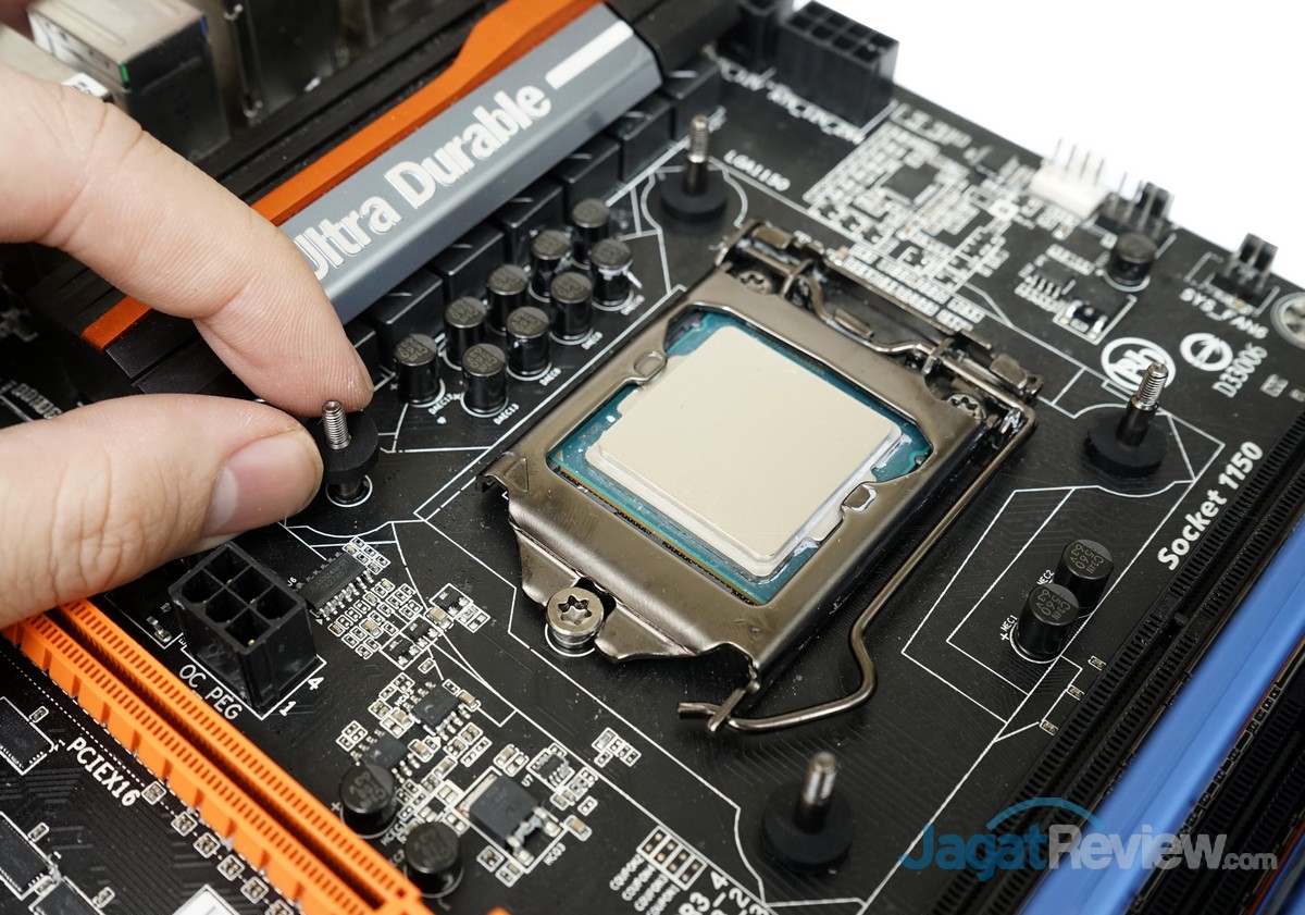 Untuk pemasangan mounting Intel yang digunakan pada sistem yang menggunakan prosesor socket LGA 1150 dapat dilakukan dengan cukup mudah. Pertama-tama masukan baut mounting ke lubang-lubang yang sesuai dengan spesifikasi socket LGA 1150 pada backplate milik Gamer Storm Captain 120 ini.
