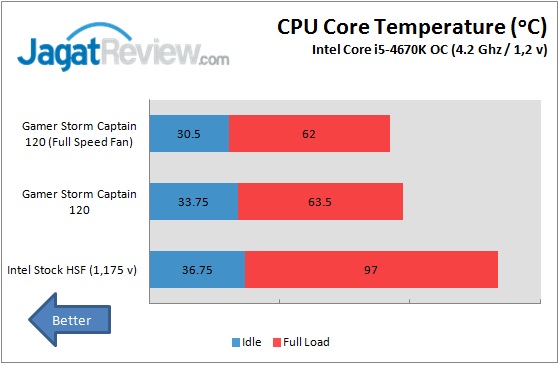 Ketika pengujian dengan Core i5 4670K dilakukan dalam keadaan prosesor teroverclock, pada kecepatan 4,2 GHz dengan tegangan 1,2 Volt, Gamer Storm Captain 120 ini mampu menahan suhu prosesor di kisaran suhu 63.5 oC atau lebih dingin 33.5oC dibandingkan dengan heatsink bawaan Intel yang suhunya sudah berada di kisaran 97oC pada saat diberi beban kerja penuh dengan software LinX.