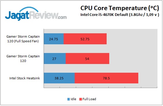 Pada saat pengujian dengan testbed dalam kondisi default, watercooling Gamer Storm Captain 120 mampu menahan suhu prosesor Intel Core i5 4670K di kisaran 54 oC atau lebih dingin 24.5 oC dibandingkan dengan heatsink bawaan Intel yang suhunya sudah berada di kisaran 78.5 oC pada saat diberi beban kerja penuh dengan software LinX. Sedangkan pada saat kondisi sistem idle, watercooling ini mampu mendinginkan prosesor pada suhu 27 oC atau lebih dingin 11.25 oC dibandingkan dengan heatsink bawaan Intel yang suhu prosesor-nya berada di 38.25 oC.