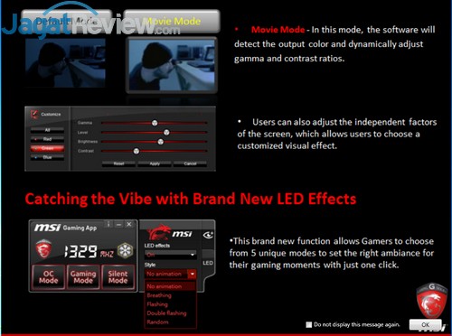 MSI Gaming App juga menawarkan pengaturan pencahaayan pada monitor dengan menggunakan sejumlah profile. Tidak ketinggalan LED dari MSI GTX 960 Gaming OC dapat diberikan efek seperti breathing, flashing, ataupun double flashing.