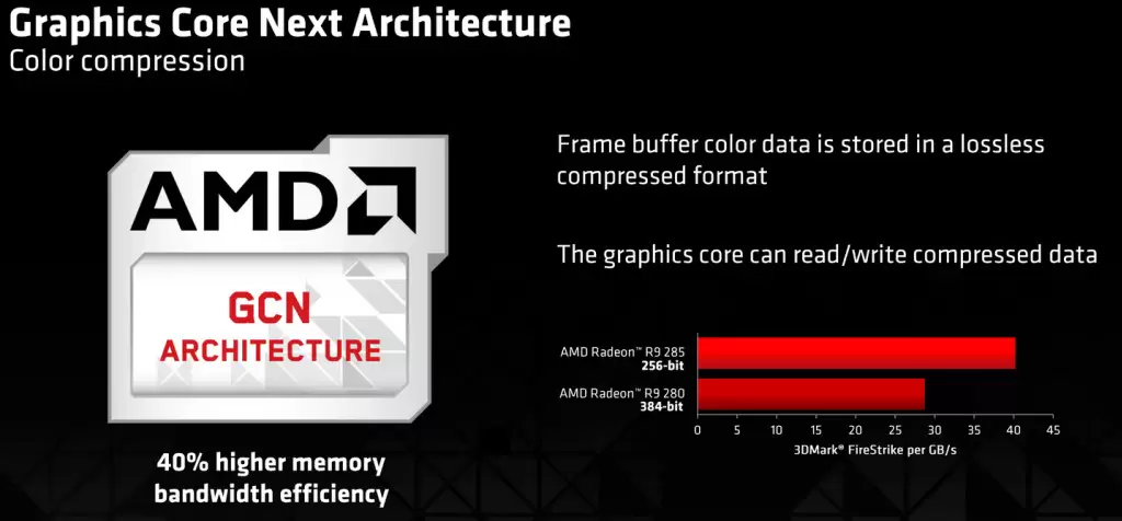 Salah satu fitur unik GCN 1.2 yang terdapat pada R9 285 Tonga adalah fitur kompresi data. Secara singkat, GPU dengan kapabilitas Color Compression akan mencoba menyimpan informasi data warna pada sebuah lossless compressed format(yang dipercaya tidak mengurangi informasi yang ditampilkan), dan kemampuan ini akan menghemat lumayan banyak data traffic yang terjadi antar GPU dan Video RAM(framebuffer)-nya. Jika teknologi ini diterapkan pada APU yang terkenal sering sekali mengalami bottleneck di Video RAM Bandwidth, tentu kami rasa peningkatannya akan signifikan.