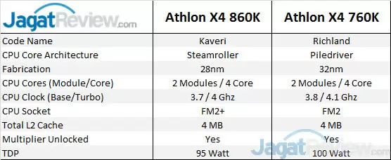 Secara singkat, Athlon X4 adalah sebuah ‘APU’, tanpa IGP. Ada 2 (dua) buah Athlon X4 yang akan kami uji kali ini, Athlon X4 760K yang berbasiskan APU ‘Richland’ (CPU Core Piledriver 32nm – sudah rilis cukup lama), dan Athlon X4 860K yang relatif lebih baru, berbasiskan APU ‘Kaveri'(CPU Core Steamroller 28nm). Berikut spesifikasi keduanya: