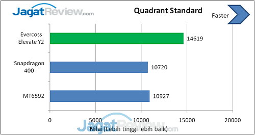 Quadrant adalah benchmark untuk CPU, I/O, dan grafis 3D. Versi yang kami gunakan adalah Standard Edition yang bisa diunduh secara gratis. Semakin tinggi nilai yang dihasilkan benchmark ini, semakin baik.
