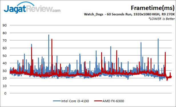 Mari kita lihat lebih dekat pengujian Watch_Dogs, dimana framerate rata-rata dari sistem AMD FX-6300 dan Core i3-4130 relatif sama, namun nilai 1% Worst FPS-nya berbeda. Disini, kami memberikan sebuah graph frametime, yang mencatat rata-rata dari 5(lima) kali run Watch_Dogs pada kedua sistem: