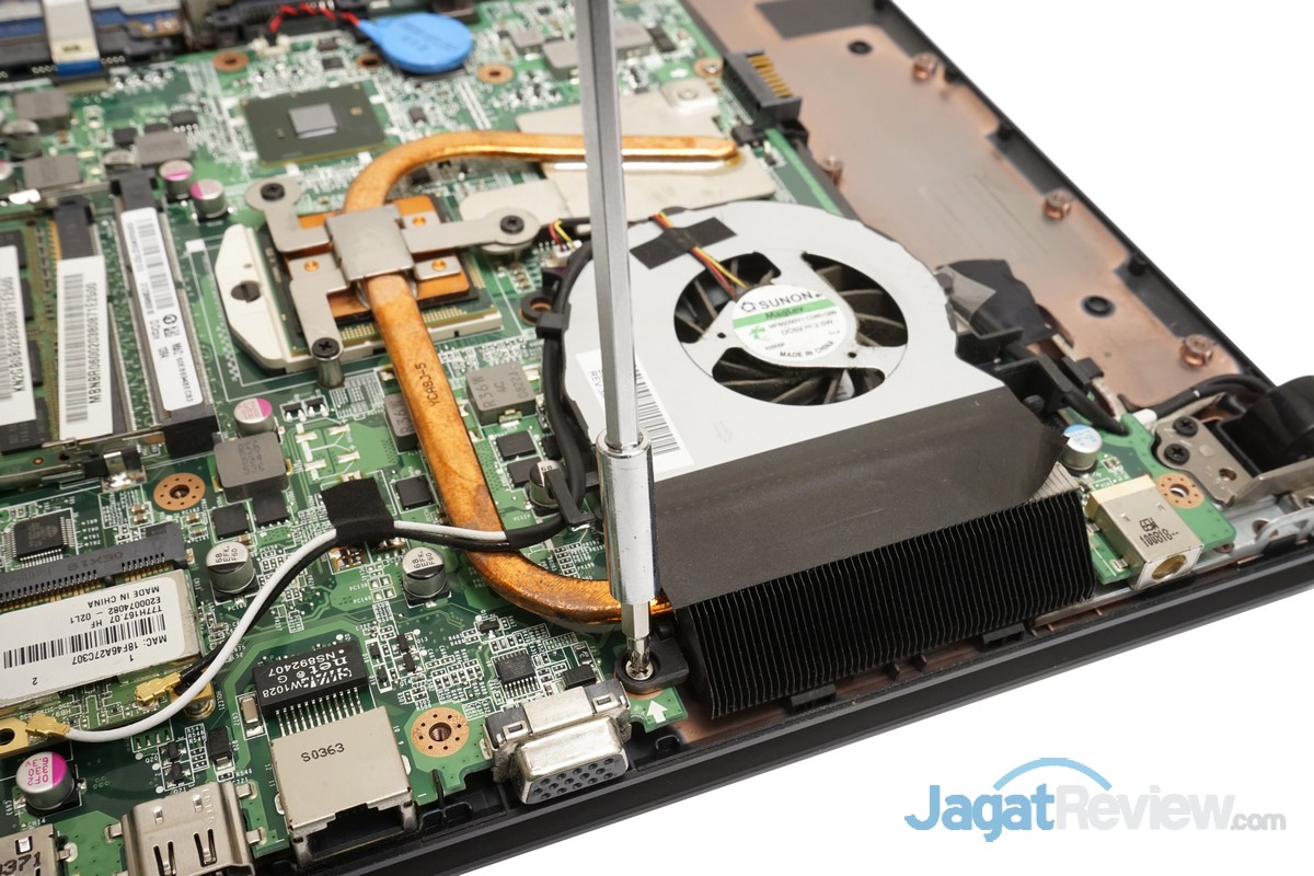 Melepas heatsink pendingin dari notebook. Perlu diketahui untuk melepas heatsink dari notebook perlu dilakukan ekstra kehati-hatian, karena thermal paste yang sudah kering dapat membuat chip prosesor melekat kuat pada heatsink. Sehingga ada kemungkinan yang cukup besar dapat membuat prosesor terlepas dari socketnya pada saat heatsink diangkat.