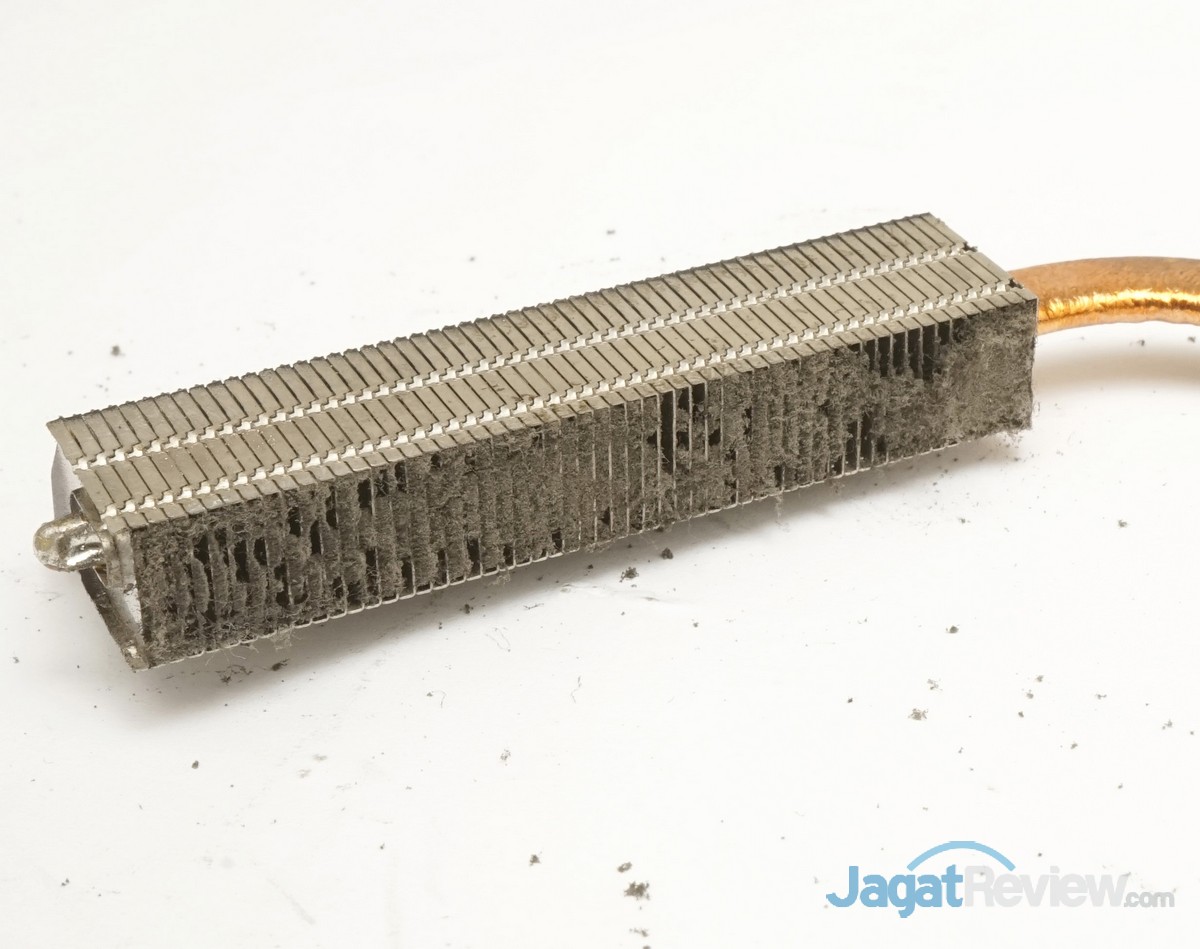 Terlihat tumpukan debu-debu yang telah menutup hampir seluruh lubang-lubang yang ada di fin-aluminium heatsink pendingin notebook ini.