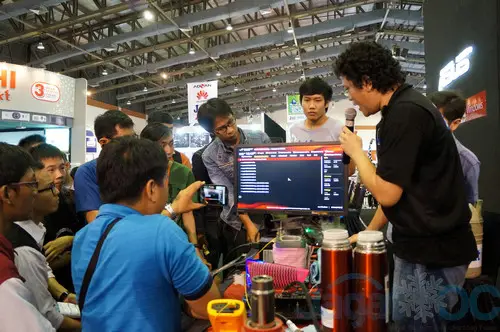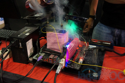 Tidak lama setelah berbagai penjelasan fitur motherboard ASUS Maximus 7 Gene, tim JagatOC langsung memulai sesi demo mereka dengan ‘mengguyur’ sistem tersebut dengan Liquid Nitrogen(LN2) untuk menurunkan suhu prosesornya ke -100 C(minus 100 C).