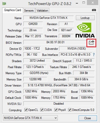 Tentu saja, Anda akan membutuhkan BIOS dari TITAN X itu sendiri. Kami menggunakan GPU-Z dan menekan tombol yang kami tandai merah ini untuk mendapatkan file BIOS dari TITAN X.