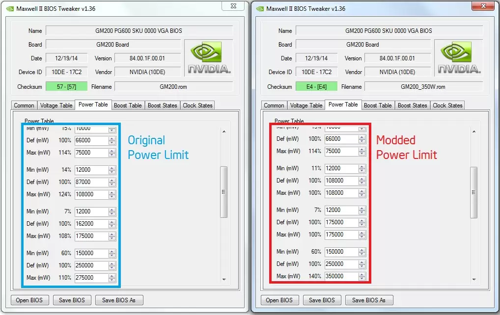 Dengan software Maxwell II BIOS Tweaker, kita akan meng-edit bagian ‘Power Table’. Singkatnya, kami meningkatkan nilai Power Limit dari BIOS kami yang tadinya ‘275000’ (275W), menjadi ‘350000’ (350 Watt). Lihat gambar di bawah ini untuk lebih jelasnya:
