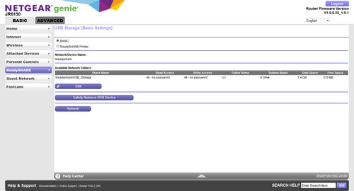 Selain untuk mendukung media server, port USB 2.0 tersebut juga mendukung fitur andalan NetGear, ReadyShare, yang memungkinkan pengguna memanfaatkan router dan storage yang terpasang sebagai NAS. Pengguna bisa mengatur hak akses storage secara manual untuk memastikan storage yang terpasang. ReadyShare juga bisa digunakan untuk membagi penggunaan printer yang terpasang di port USB 2.0 ke jaringan lokal.