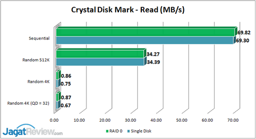 Hasil yang didapatkan di tes menggunakan Crystal Disk Mark memang tidak bisa dikatakan impresif. Angka yang ditunjukkan baik dalam mode single drive maupun RAID 0 berada di kisaran cukup baik, tetapi tidaklah terlalu tinggi. Miripnya hasil antara mode single drive dan RAID 0 menunjukkan bahwa keterbatasan NAS menjadi penghambat WD Red Pro menunjukkan performanya.