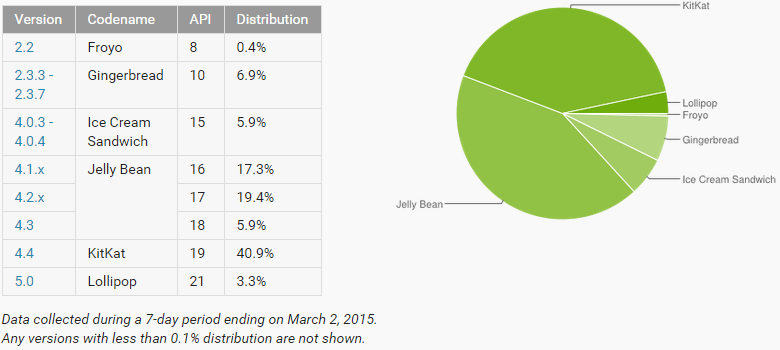 Secara berurutan, saat ini Jelly Bean masih menduduki posisi pertama, disusul KitKat di posisi ke dua, Gingerbread di posisi ke tiga, Ice Cream Sandwich (ICS) di posisi ke empat, Lollipop di posisi ke lima dan Froyo di posisi ke enam. Diperkirakan KitKat akan mampu melampaui Jelly Bean sebelum Lollipop mampu melampaui Gingerbread.