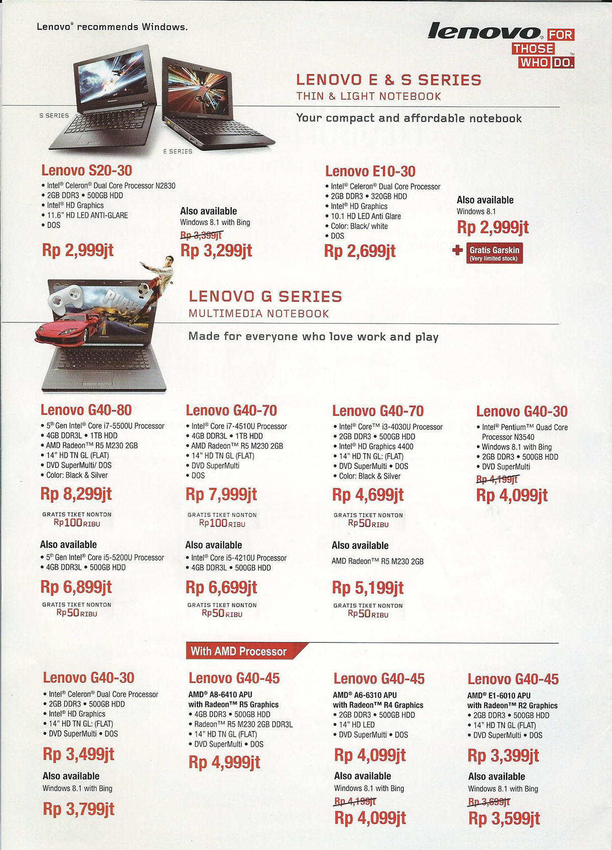 - Lenovo G40-30 Intel Celeron Dual Core Windows 8.1 with Bing – Rp 3.799.000
