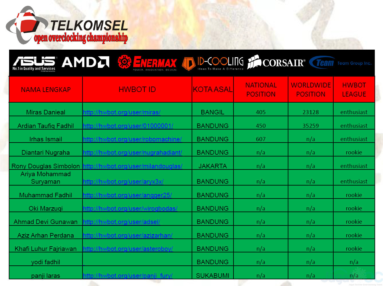 Kompetisi TOOC 2015 terdiri dari 3 seri kualifikasi di 3 kota, dimana setiap seri-nya dibuka untuk 40(empat puluh) overclocker. Juara 1 hingga 3 di setiap kualifikasi mendapatkan tiket untuk maju ke babak Grand Final yang akan diadakan bulan Desember 2015 mendatang. Beberapa rekan-rekan kami dari JagatReview Overclocking Team (JagatOC) ikut ambil bagian dalam TOOC 2015 Seri 1 tersebut,yang diadakan pada 27 Februari – 1 Maret 2015 di GraPARI Telkomsel di Paris Van Java, Bandung.