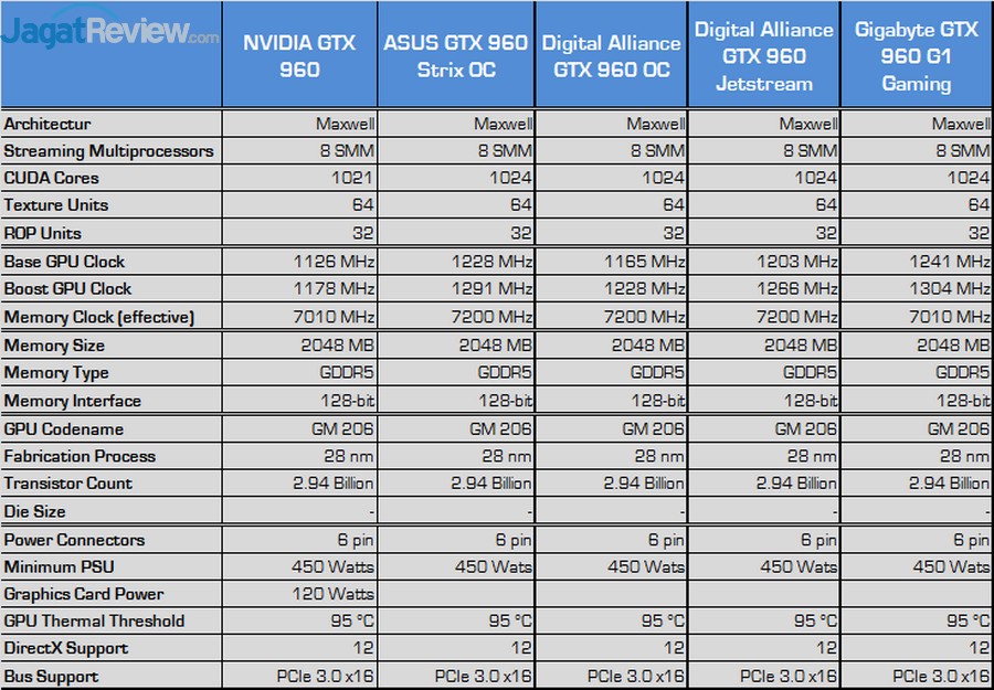 Kami menyusun tabel perbandingan graphics card GTX 960 ini berdasarkan abjad, bukan berdasarkan performa ataupun peringkat.