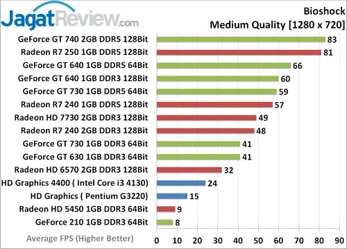 Dalam pengujian Bioshock Infinite, dengan menggunakan setting medium untuk kualitas tampilan yang baik, empat peserta gagal memberikan pengalaman bermain yang baik. Walaupun begitu, performanya masih belum cukup untuk mendapatkan framerate rata-rata 30 FPS untuk menjalankan game ini dengan nyaman. Graphics card lain sudah bisa menangani game ini di rata-rata 30 FPS ke atas seperti R7 250 dan GT 740 dengan FPS yang cukup tinggi pada 1360×768, yaitu 76 FPS dan 74 FPS.
