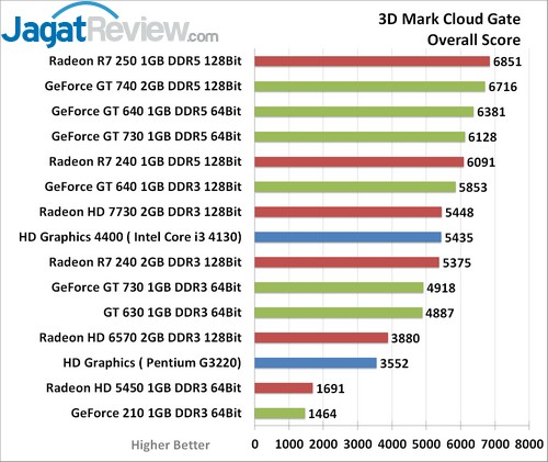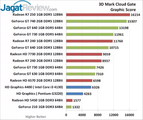 Kami menggunakan benchmark sintetis ini untuk melihat sejauh mana perbedaan kemampuan antara peserta pengujian. Terlihat, kedua IGP dari Intel berhasil mengungguli HD 5450 dan GT 210 dengan perbedaan performa antara 3x hingga 4x! Untuk benchmark sintetis ini, R7 250 dari AMD memimpin di posisi teratas dengan poin graphcis score mencapai 16154. Dari kubu NVIDIA, GT 740 memimpin dengan skor 15307.