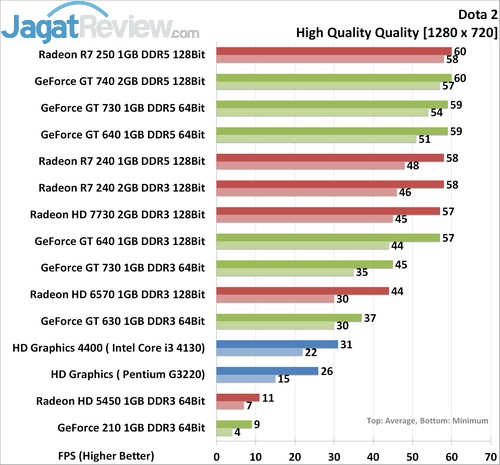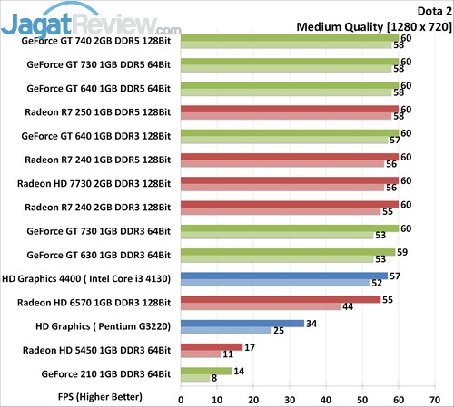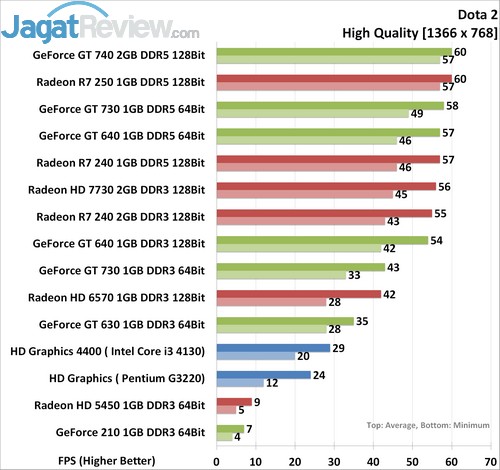 Pada resolusi ini, HD 6570 nyaris tidak dapat memberikan FPS yang baik dari segi minimum FPS. HD 6570 mencatatkan 44 FPS, tipis di bawah angka minimal yang kami harapkan. Sedangkan di barusan VGA murah, rata-rata sudah bisa menjalankan DOTA 2 dengan sangat baik. VGA dengan harga Rp 500 ribu hingga Rp 700 ribu, seperti HD 7730 dan R7 240 DDR3 dari AMD dan GT 730 DDR3 dan GT 630 DDR3 dari NVIDIA masih bisa mendapatkan framerate cukup tinggi, dengan angka minimal di atas 45 FPS. Bahkan, IGP HD Graphics 4400 juga dapat melakukannya.