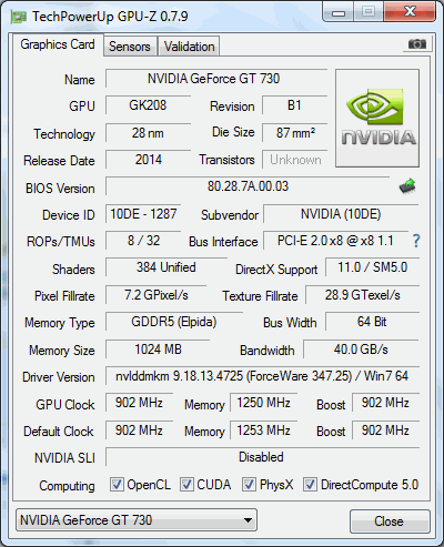 Graphics card GT 730 dengan memori 1GB GDDR5 64-bit yang satu ini memiliki spesifikasi yang sepintas “terlihat lebih baik” dari yang kami bahas sebelumnya. GPU clock yang dimilikinya adalah 902 MHz, masih sesuai dengan reference dari NVIDIA. Sedangkan memory clock-nya berada di 1253 MHz.