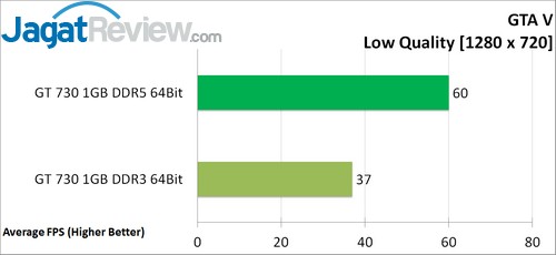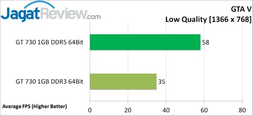 Melihat minat terhadap game yang satu ini tengah berada di titik tertinggi, kami menyertakannya untuk uji singkat kali ini! Tercatat, GT 730 GDDR5 mampu menghasilkan framerate yang stabil di 60 FPS pada resolusi 1280×720, sementara GT 730 DDR3 sendiri hanya mampu mencatatkan 37 FPS. Ketika resolusi ditingkatkan ke 1366×768, GT 730 GDDR5 masih memimpinn dengan rata-rata 58 FPS, dibandingkan GT 730 DDR3 dengan 35 FPS.