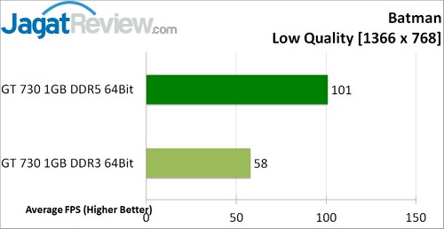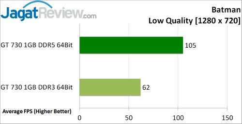 Sekali lagi, GT 730 GDDR5 menunjukkan supremasinya dengan memimpin catatan average framerate dengan keunggulan hampir 50% pada game Batman Arkham City. GT 730 GDDR5 berhasil mencatatkan framerate di atas 100 FPS. GT 730 DDR3 hanya berhasil mencatatkan angka 58 FPS saja.