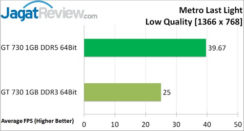 Untuk salah satu game yang masih dikategorikan berat sampai saat ini, Metro Last Light, lagi-lagi GT 730 GDDR5 mencatatkan FPS lebih tinggi daripada GT 730 DDR3. GT 730 GDDR5 mampu menghasilkan 41.5 FPS pada resolusi 1280×720 dan 39.67 FPS pada resolusi 1366×768.