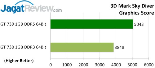 Pada pengujian benchmark sintetis kali ini, terlihat GT 730 GDDR5 memiliki performa lebih tinggi daripada varian dengan DDR3. Graphics score GT 730 GDDR5 mampu menghasilkan skor 5043 poin, sedangkan versi DDR3 nya hanya mampu mencatatkan 3848 poin.