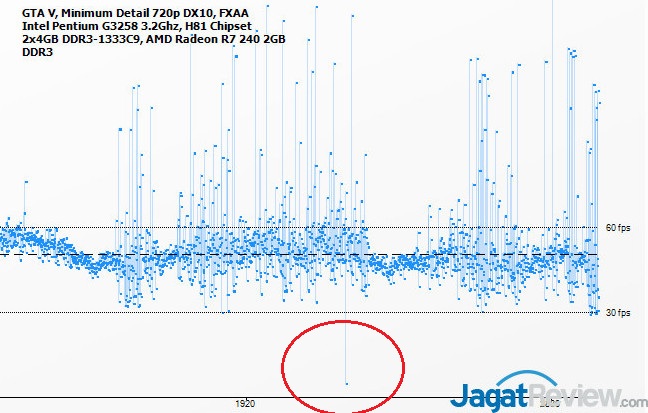 Dengan patch baru, sekarang ‘stutter’ yang sangat mengganggu sudah hilang. Bermodal sebuah VGA murah 700Ribu-an, anda sudah bisa menikmati game GTA V pada minimum detail resolusi 720p pada rata-rata 50 FPS. Memang, sesekali FPS akan agak turun pada scene yang cukup intensif pada CPU dan Grafis (saat kejar-kejaran dengan polisi di tengah kota misalnya), sehingga nilai 1% Minimum FPS-nya turun ke angka 34 FPS-an. Namun, hasil ini jauh lebih masuk akal ketimbang versi terdahulu yang membuat nilai 1% minimum FPS menjadi luar biasa rendah.