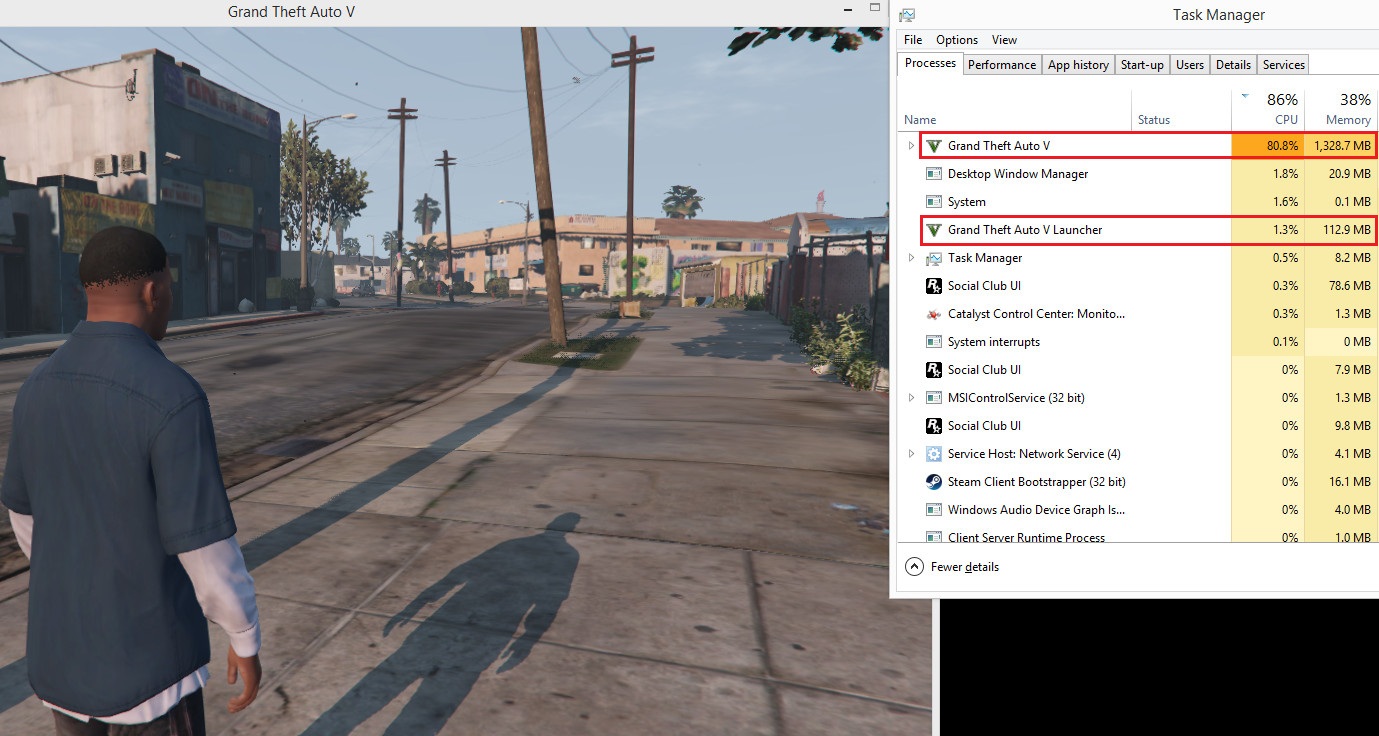 Bisa dilihat di atas, meski hanya menggunakan prosesor dual-core, sekarang Total CPU Usage dari Pentium G3258 yang tadinya selalu ada di 100% pada versi sebelumnya, sekarang ada di 86%, dan GTA V Launcher yang tadinya menggunakan resource 10-20%, sekarang ada di 1.2% saja. Beberapa gamer tadinya mencoba mematikan process GTA V launcher secara manual, namun dengan patch baru ini anda tidak perlu melakukannya.