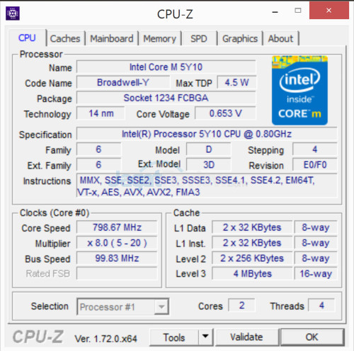 Intel Core M-5Y10 merupakan prosesor Core M dengan kecepatan terendah. Prosesor Core M memiliki 2(dua) buah inti yang bisa menjalankan 4(empat) thread sekaligus berkat HyperThreading, dan didukung kecepatan base sebesar 800Mhz, dan kecepatan Turbo Maksimum sebesar 2 Ghz. Yang mengejutkan: TDP(thermal design power) prosesor ini hanya 4.5 Watt! Dengan rating TDP serendah itu, cukup masuk akal jika Intel menargetkan Core M untuk berjalan di sebuah fanless tablet yang memiliki kemampuan pendinginan sangat terbatas. Sebagai perbandingan, rata-rata prosesor Ultra Low Voltage(ULV) dari Intel generasi sebelumnya memiliki rating TDP 11.5 hingga 15 Watt.