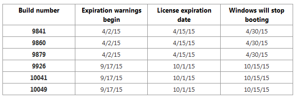 Salah satu support engineer dari Microsoft, dengan nickname RajithR, menampilkan di forum diskusi Microsoft tabel berisi batas masa pakai Windows 10 Preview untuk berbagai build yang ada. Berikut ini daftar build Windows 10 Preview beserta dengan informasi batas akhir masa pakainya: