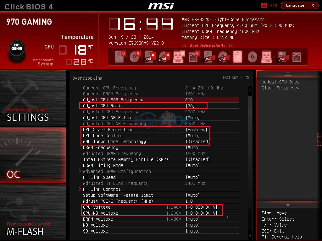 AMD FX-8370 memiliki kecepatan default 3.3Ghz di Voltase CPU(VCore)sekitar 1.2V pada saat load 8-core. Untuk mengubah kecepatannya menjadi 4 Ghz, kami melakukan setting: