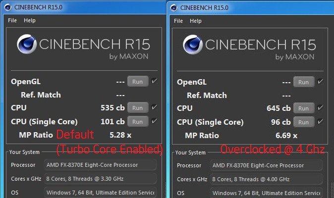 Dengan software benchmark CINEBENCH R15, kami mengukur kemampuan prosesor FX-8370E, sebelum dan sesudah overclock. Berikut hasilnya: