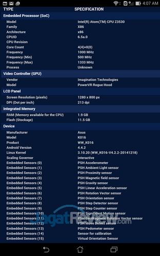 ASUS FonePad 8 menggunakan SoC Intel BayTrail dengan prosesor quad core Atom Silvermont Z3530 berkecepatan 1,33 GHz dan GPU PowerVR G6430. RAM yang terpasang sebesar 2 GB dan memiliki storage internal 16 GB yang dapat ditambah dengan microSD. Layar berdimensi 8 inci-nya memiliki resolusi 1280×800 yang telah menggunakan Oleophobic coating yang anti minyak. Tablet dual SIM ini pun telah menggunakan Android Kitkat 4.4.2 yang dijalankan dengan baterai berkapasitas 4000mAh.
