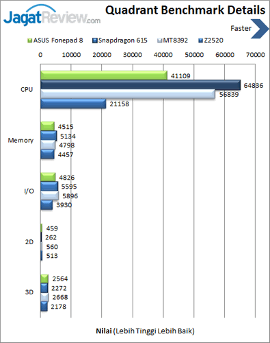 Aplikasi gratis yang satu ini menghitung nilai dari CPU, I/O, dan GPU dengan menggunakan engine software tersendiri. Semakin tinggi nilainya, semakin baik. Di versi standar yang dapat dipakai oleh semua orang ini, perolehan yang didapat hanyalah nilai totalnya. Versi yang digunakan pada artikel kali ini adalah Quadrant Standard versi 2.0 yang memiliki hasil berbeda dengan versi sebelumnya, akan tetapi menampilkan hasil lengkap tanpa harus membeli versi berbayarnya.
