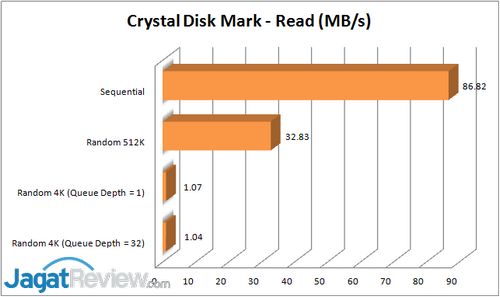 Hasil pengujian Crystal Disk Mark menunjukkan bahwa RN10200 memiliki performa yang mencukupicukup baik ketika membaca data dari dalam storage. Untuk penulisan data pecahan kecil dalam jumlah banyak, NAS ini mampu menunjukkan performa yang cukup baik. Namun, untuk penulisan data besar, performa NAS ini bisa dikatakan standar.